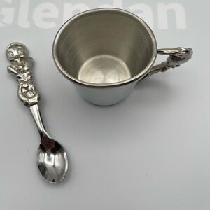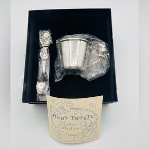 The Warner Bros. Baby Tweety Looney Tunes Pewter Feeding Set is a rare and adorable collectible item featuring Tweety Bird in a silver pewter color. This rare set is part of the popular Looney Tunes franchise, making it a sought-after piece for fans of animation merchandise. Baby Cup and Spoon. New in Box.