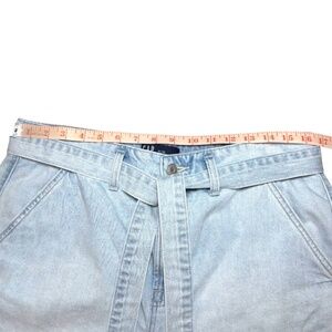 Stylish high waist shorts. Light blue denim. Features a tie belt and front pockets.
