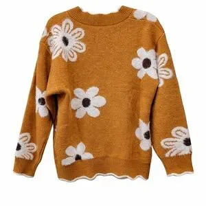 Cozy up in this stylish floral knit sweater. Featuring a vibrant mustard color with white flower patterns, it's perfect for adding a pop of color to your wardrobe.