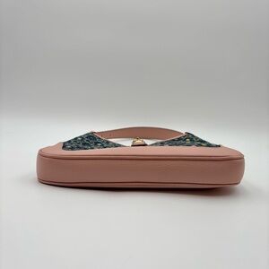 Beautiful and rare Gucci Jackie 1961 bag in signature GG denim with delicate floral embroidery and soft blush pink leather trim. This limited edition piece features the iconic gold-tone piston closure and a timeless shoulder bag silhouette.
