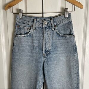 Beautifully worn and vintage looking jeans by AGOLDE. Jeans have no tags/size or markings except for “agolde” on the buttons. Waist measures are approximately 24” with a high rise design. Raw, fringed hems.