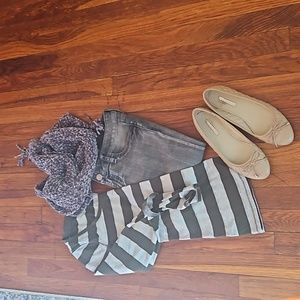 long sleeve tee with green stripes and ecru lace