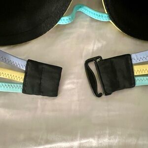 collection features a sleek black base with vibrant neon turquoise, lavender, and yellow trim. The structured cups provide great support, complemented by a stylish triple-strap back with an adjustable G-hook closure. Designed for versatility, the neck straps are fully removable, allowing you to wear it as a supportive halter or a chic strapless bandeau.