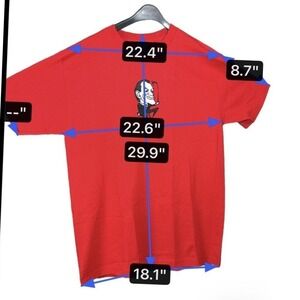 Actual Measurements: Shoulder width: 22.4 in, Chest (pit to pit): 22.6 in, Front length: 29.9 in, Bottom hem width: 18.1 in, Sleeve length: 8.7 in.
