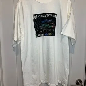 Graphic tee featuring Calgary Vintage Racing Club design. Includes classic cars and event details. Perfect for car enthusiasts.