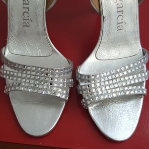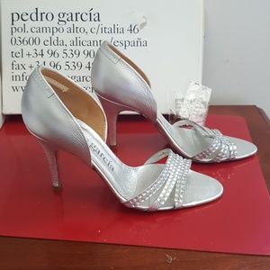 Silver open-toe sandals w/ three rows of Swarovski rhinestones. Leather. Consult Pedro Garcia website for help with sizing. These are a 38 1/2. According to them is a 8.5 US.