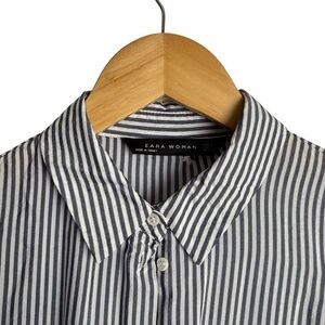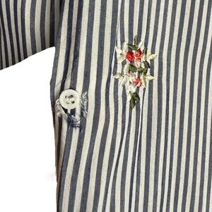 Zara Blue Pin Striped Flowing Embroidered Floral Button Down Blouse with Collar Neckline, Ruffle Hem, Side Slits, Relaxed Fit. Women’s Size Small.