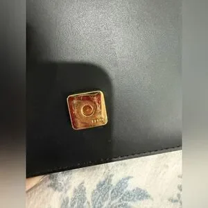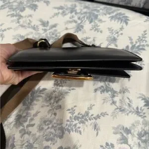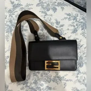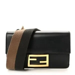This is an authentic FENDI Vitello King Mini Flat Baguette in Black. This beautiful shoulder bag is crafted of smooth black calfskin leather with a brown and black fabric strap. The bag features a polished gold Fendi FF lock that opens the front flap to a black suede interior with card slots.