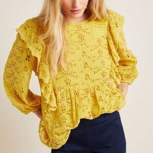 Anthropologie Clementine Eyelet Lace Blouse 20W Mustard Yellow Boho Peasant Top