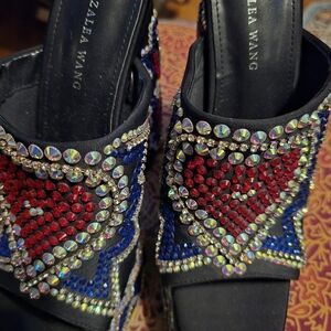Step out in style with Azalea Wang's dazzling platform heels. Featuring a bold black base adorned with red and blue crystal embellishments, these shoes are perfect for making a statement.