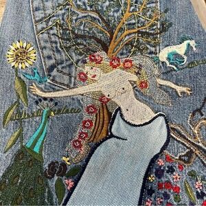 Rare and highly collectible — the 2000s True Religion "Lady Godiva" jeans are one of the brand's most sought-after embroidered designs. Featuring intricate multicolor artwork of Lady Godiva, a unicorn, and a peacock across the back pockets, these jeans are a standout archive piece coveted by both collectors and Y2K trend lovers. Made in the USA with the brand's signature heavy contrast stitching.