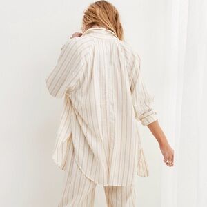 Aerie linen blend button-down shirt in a soft neutral stripe. Lightweight and breathable with an easy oversized fit. Features a classic collar, front button closure, and oversized chest pocket.
