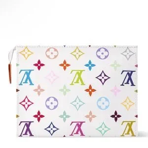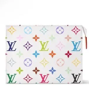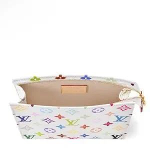 Chic Louis Vuitton cosmetic case. Features vibrant multicolor monogram on white. Ideal for stylish organization.