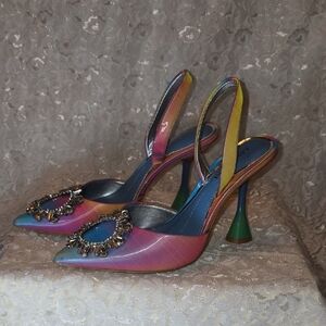 Stunning multicolor heels with jeweled embellishments. Ideal for a bold fashion statement.