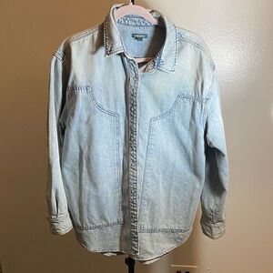 Stylish light blue jean jacket. Classic design with button closure. Perfect for casual wear.