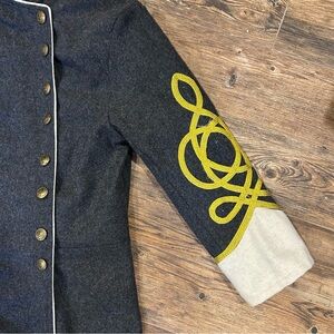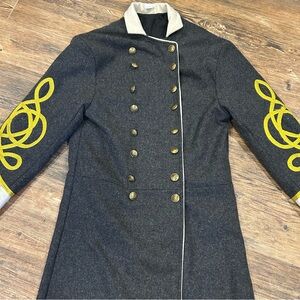 Civil war reenactment officer jacket. Elevate your style with this sophisticated men's gray coat featuring striking gold accents on the sleeves. The double-breasted design adds a touch of elegance, making it perfect for both formal and casual occasions.