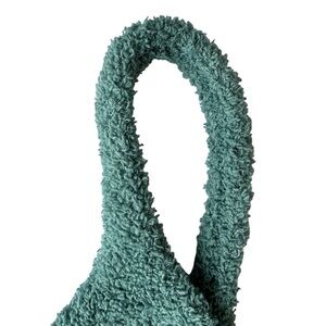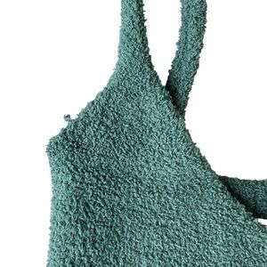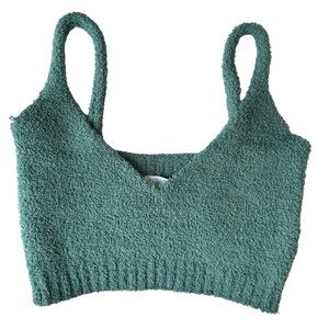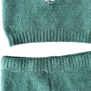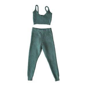 Chic teal knit crop top with matching pants. Ideal for casual wear.