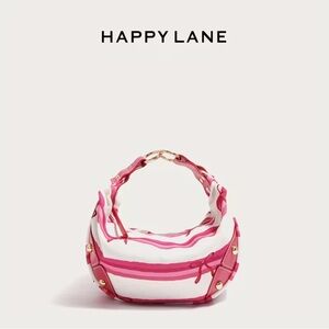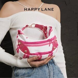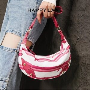 Brand new, never used pink and white stripe crescent shoulder/hobo bag with a dreamy coquette aesthetic. Features a silky scarf-print exterior with hot pink stripes, adorable bow details, gold stud hardware, and a pink faux leather trim strap. The crescent/moon shape is super on-trend right now!