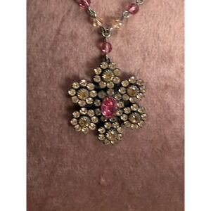 • Intricate flower-shaped pendant encrusted with champagne-colored crystals and a central pink oval stone.