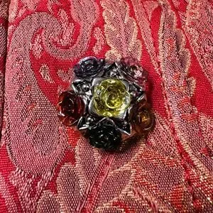 Rich red and metallic gold featuring an elaborate all-over floral paisley tapestry brocade design, unique short coat with a striking wide, rounded collar and cropped fit, solid red full lining and ornate embellished rose design buttons covered snap close. This is a vintage style, one of a kind custom creation, handmade (not mass-produced) statement piece. Maximalist, baroque, Victorian-inspired, art deco, formal wear, event, designer quality aesthetics.