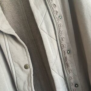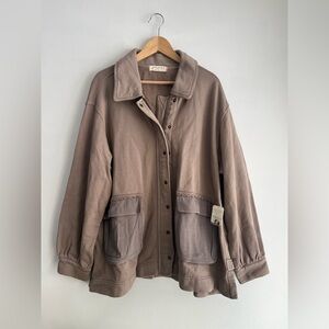 Brand new casual jacket from Free People. Made of sweatshirt material, soft and comfy, you’d never know it’s water repellent but yet it is. Colour is a light brown called “dusted cocoa”. The Free People Alexa jacket features an oversized fit and cargo style flap pockets. This cotton-blend jacket is completed with a water-repellent finish, a spread collar, and button cuffs. It has a front zip closure with snap storm placket, front bellows pockets, and side slits.
