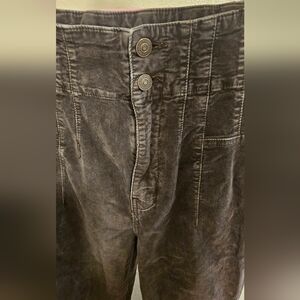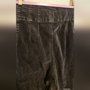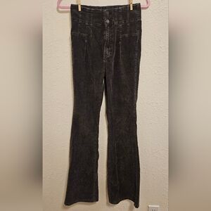 Jayde Flared Corduroy Pants from the We The Free line by Free People. These pants are characterized by their high-rise fit, charcoal gray color, and a distinctive front yoke with paneled seam detailing.
