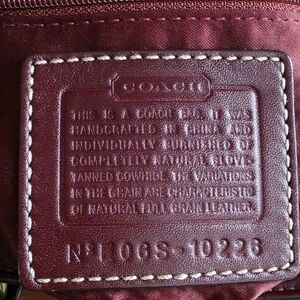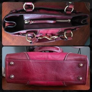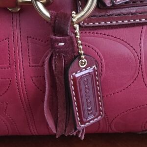 Coach Hamptons Clip Signature Embossed Red Leather Satchel Y2K Vintage is Coach style number 10226, made in 2006. The exterior of the bag is made of red leather, embossed and stitched with Coach's signature C pattern. The corners, top trim, handles and other accents are made with a darker toned red leather. The bag has contrast stitching, and insets of suede on the handles.