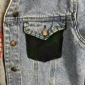 Jordache Original denim jacket showcasing unique plaid patchwork detailing. Features a bold red stitch accent along the front placket and contrasting plaid fabric on the collar, pockets, and sleeves. This custom piece offers a distinctive blend of classic denim style with a playful, updated aesthetic.