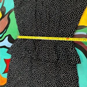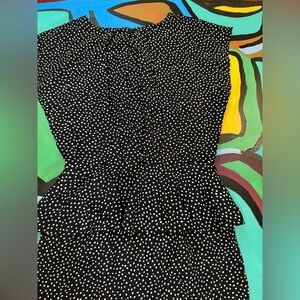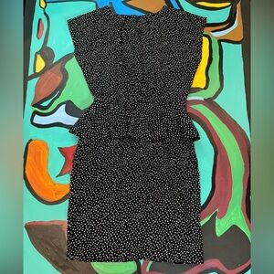 Chic dress with a playful polka dot pattern with a flattering peplum top. Sleeveless design for a modern, comfortable look. Perfect for work or special events.