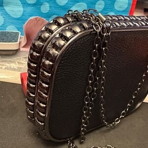 Elegant black clutch with studded details and a sleek chain strap. Perfect for a night out or special occasion. Used only once for a party.