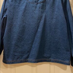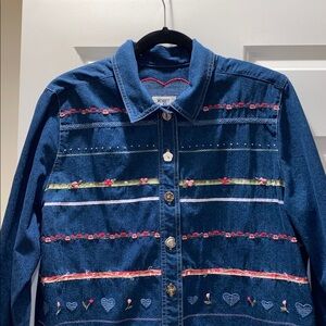 vintage embroidered denim jacket. this is so unique! features different buttons, embroidered flowers, ribbon stripes, and sewed on beads. thin denim, feels thicker than a top though. dark blue wash.