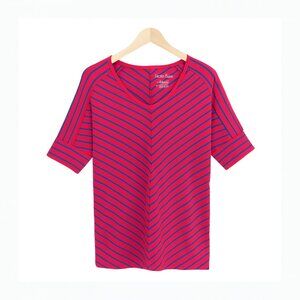 Keywords and style tags: dolman sleeve, striped top, v neck tee, soft stretch, everyday basics, casual style, comfy fit, hanna andersson, red blue stripes, modern classic, minimalist casual, breathable knit, wardrobe staple