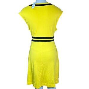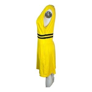Brighten your wardrobe with this stunning yellow V-neck dress featuring elegant black trim. Perfect for any occasion, this dress combines style and comfort effortlessly.