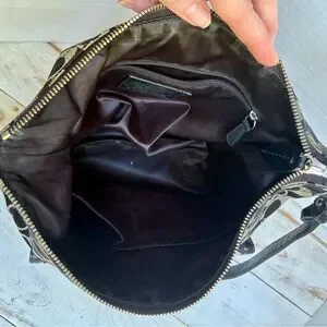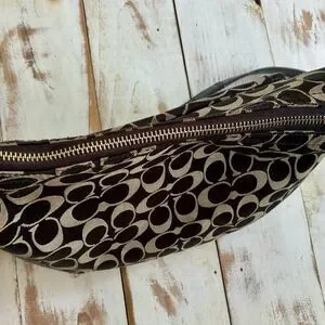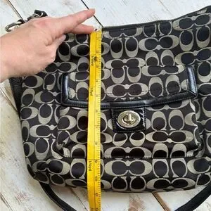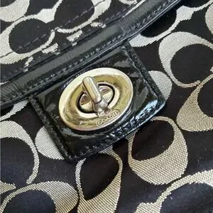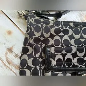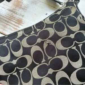 This Coach purse (The Penelope bag) is a black canvas shoulder bag with Y2K vibes and in nice shape and clean overall but there are a few spots where the canvas thread of the Cs for Coach have unraveled, giving it a spotty look if some places.
