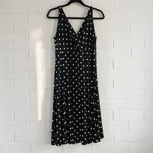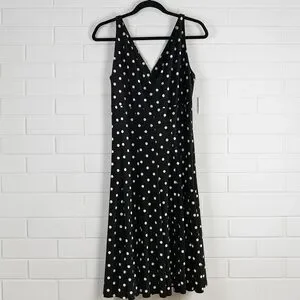 Classic black and cream polka dot midi dress by American Living. Features a flattering faux wrap V-neckline, elastic waist for comfort, and flowy A-line skirt. Easy to dress up or down for brunch, church, office, weddings, or date night.