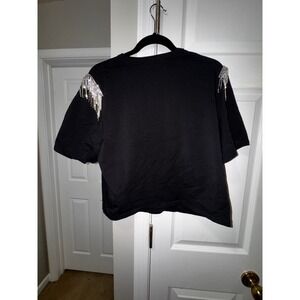 Veronica Beard Black Rhinestone Fringe Shoulder Epaulette Crewneck Tee Shirt