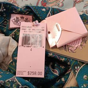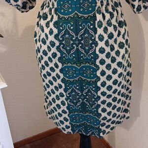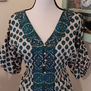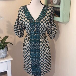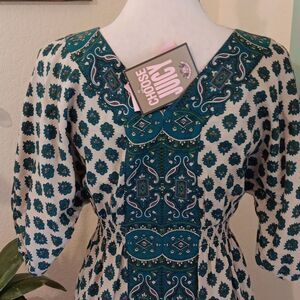 Chic teal paisley dress by Juicy Couture. Sweet tunic. Beautiful buttons. Kimono sleeves with elastic ends. Contrasting fabric trim. Size 4 measures 36 at chest, 24-30 under chest. 40 at hips. 35.5 long from shoulder to hem. Adds a stylish flair to your wardrobe.