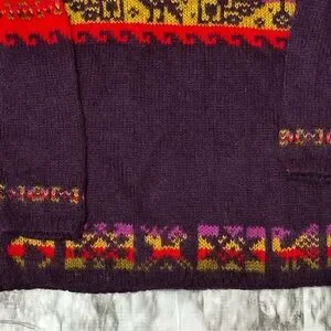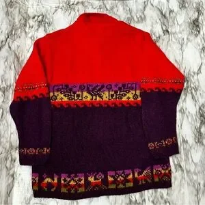 Stylish turtleneck with bold red and purple pattern. Perfect for a chic look.
