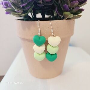 Eye-catching pair of dangle earrings, featuring three heart-shaped charms in graduated shades of green and white. These charming earrings offer a playful aesthetic with their tiered heart design, which adds a touch of whimsy to any look. The earring hooks are silver-toned, ensuring a comfortable and secure fit. Perfect for adding a pop of color to casual outfits or for celebrating special occasions like St. Patrick's Day, date night, or a fun brunch with friends.