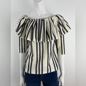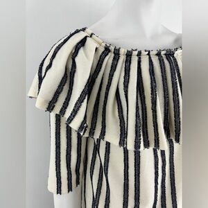 BANANA REPUBLIC off shoulder top. Vertical navy fringed stripes on a super soft ivory ruffled knit off shoulder top is perfect for spring! Elastic band around top.3/4 sleeves/ Cotton/polyester.