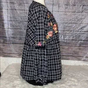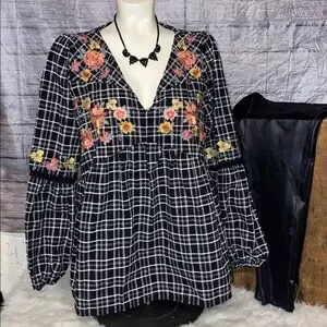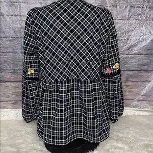Savanna Jane black and white plaid top with embroidered flowers size large euc
