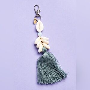 Handmade keychain is decorated with cowry shells, an iridescent moonstone, and tassel.