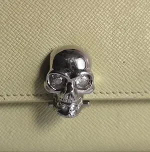 Alexander McQueen Skull Wallet. Yellow Saffiano Leather. Silver-Tone Hardware with Crystal Embellishments. Nylon Lining & Four Interior Pockets with Card Slots. Snap Closure. Height: 3.75"