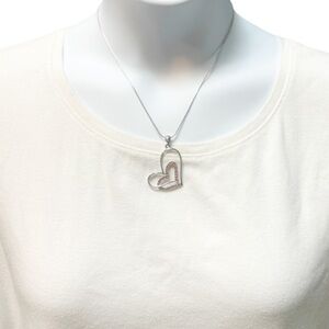 Beautiful silver-tone open heart pendant necklace featuring delicate pink crystal accents for a subtle sparkle. The modern layered heart design gives this piece a romantic yet minimalist feel—perfect for everyday wear or special occasions.