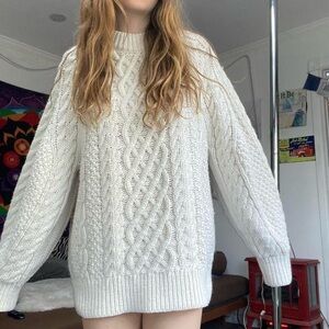 Stay warm and stylish with this cozy white cable knit sweater. Perfect for any casual outing.