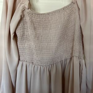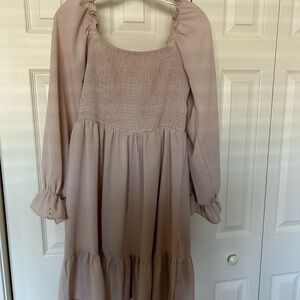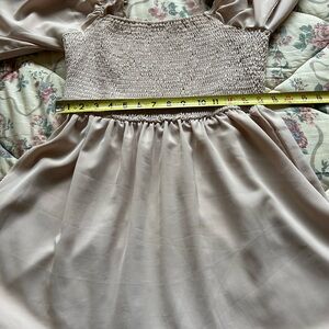 This elegant cream midi dress features a smocked bodice and flowing sleeves, perfect for any occasion. Its soft color and stylish design make it a versatile addition to your wardrobe.