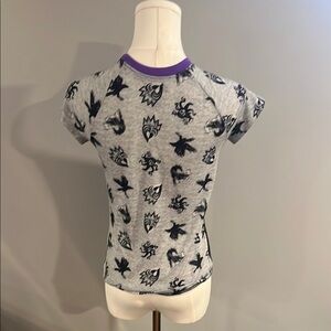 This Disney t-shirt features a striking black body with gray short sleeves, offering a fitted style that highlights a vibrant graphic design on the front. Perfect for casual wear, this top combines comfort with a touch of playful elegance.