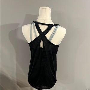 This sleeveless tank top from All in Motion features a classic crew neckline and a relaxed fit, perfect for casual wear. The top is predominantly black with white trim, offering a stylish contrast. Made from a soft, stretchy material, it ensures comfort and ease of movement.