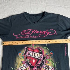 Vintage Ed Hardy Christian Audigier Love Kills Slowly Heart and Skull Crossbones V-Neck T-Shirt Womens Small