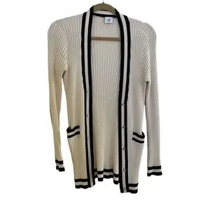 Cream with navy stripe on front of sweater and cuffs. Small gold button detailing.. A classic look!